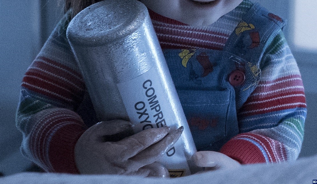 A new Cult of Chucky image released this week sure has us scratching our heads, as it highlights something super strange about Chucky’s right hand. In this particular shot, Chucky is holding a canister of compressed oxygen; though his left hand looks totally normal, his right hand is weirdly deformed and monstrous.